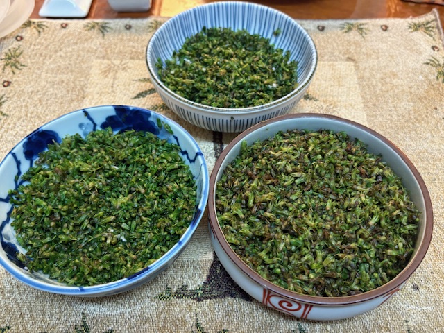 緑や少々茶色になった実を指でしごき取る(squeeze the seeds off with fingers)。あとは数十秒ゆでて冷まし、水気を切り(pat them dry)塩を加えて完成。