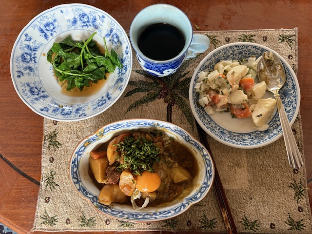 太古に職場近くのガード下にあるカレー店が、必ず生卵を割って落としてくれて以来、ひとつの癖が付いてしまっている。自製のポテトサラダに自製の紫蘇の実漬け、それに猫の額からの明日葉のお浸しだ。玄米少々を覆うカレーにも紫蘇の実てんこ盛りだ。馬鈴薯が多すぎたのは加齢薯であろうか・・・(笑)