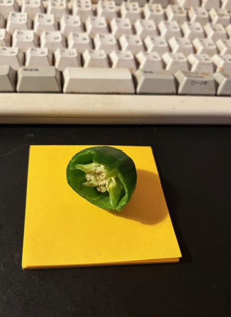 A Little Green Pepper 小さいのがいくつもまだ頑張っているので1個もぎる。今回は小さすぎて刺身にせず、そのまま食す。なんと甘い。すぐにタネまで到達。さあ、困ったね。しばしキーボード前で思案。結論は、Dirty Harry Magnum Forceの締めゼリフを借用。(^_^) “A man’s got to know his limitations.”