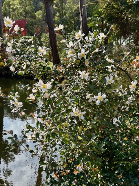 山茶花 daywalkerと言うと、昼間も歩けるバンパイアのことらしい。nightwalkerにしても何とかしないと。 円覚寺の入口でクリスマスカード用の写真を撮る。横須賀線の線路の反対側にある池のほとりに、白い山茶花が白昼の陽を浴びている。冬だなもうそろそろ。白鷺池(びゃくろち)と呼ぶとある。しらさぎいけでもよいような気もするがのう。 Sasanqua in the noonday sun
