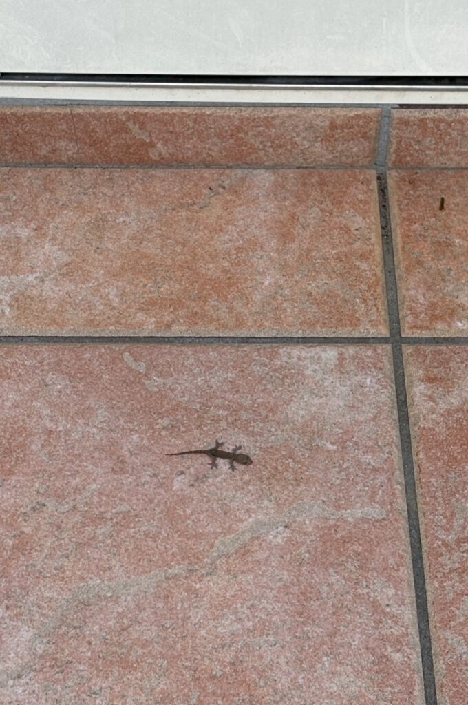 靴を履くと三和土に小さなヤモリがいた。おお、ご苦労さん、どうやって入ったの?と声を掛ける。ドアを開けるとヤモリも外に向かう。挟んで潰さないように完全に出切ってからドアを閉める。写真を撮る。