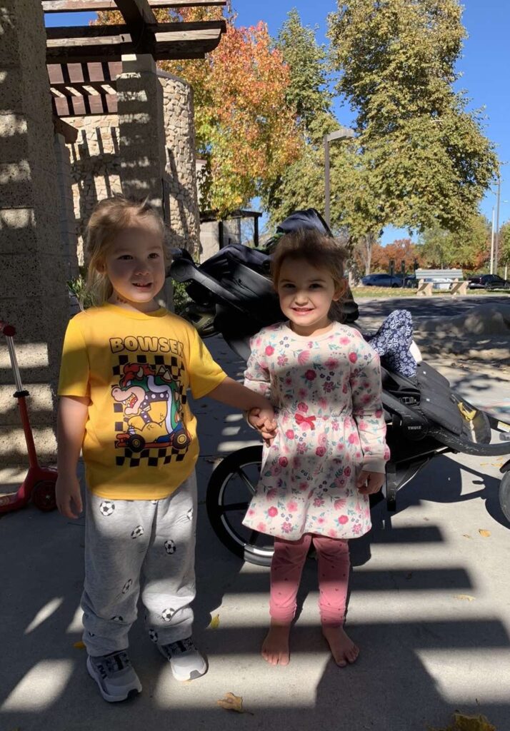 これは孫のリキ君(3歳半)と近所の子。この子たちはこれからどこへ行くのだろう。フリーダムの果てぬところへ行くんだよ。