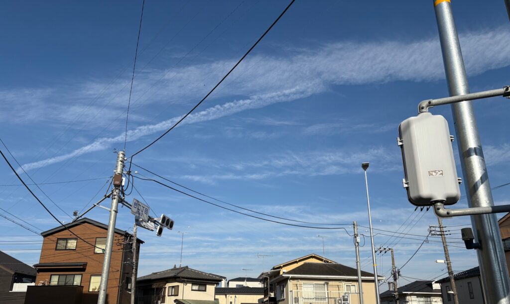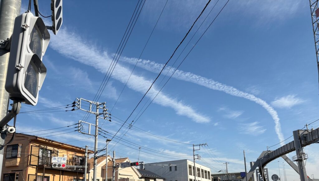似たような雲をアメリカの空でここ数年よく見る。最近は娘のいるカリフォルニアに行くばかりだが、空が日によるけれど太い筋だらけになることがある。この雲の下の空気中に、あるべからざる化学物質が探知されたという報告もある。erroneous theoryだと定義する大手のサイトもあるが、その目的は風評の域を飛び越えつつあり、評判すこぶる悪く、CHEMTRAILと名が付いた。これはharmful chemicals+trailという混成語である。