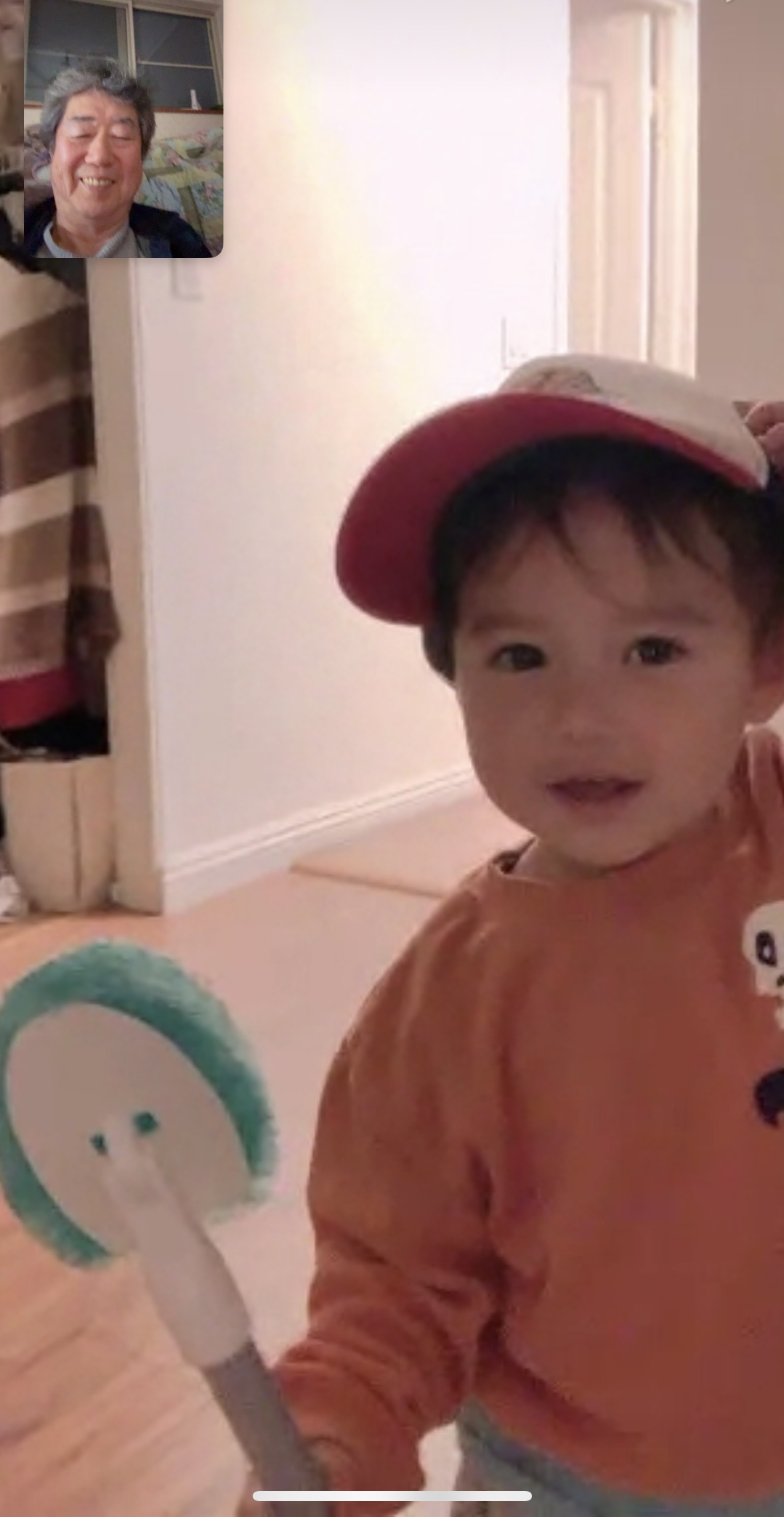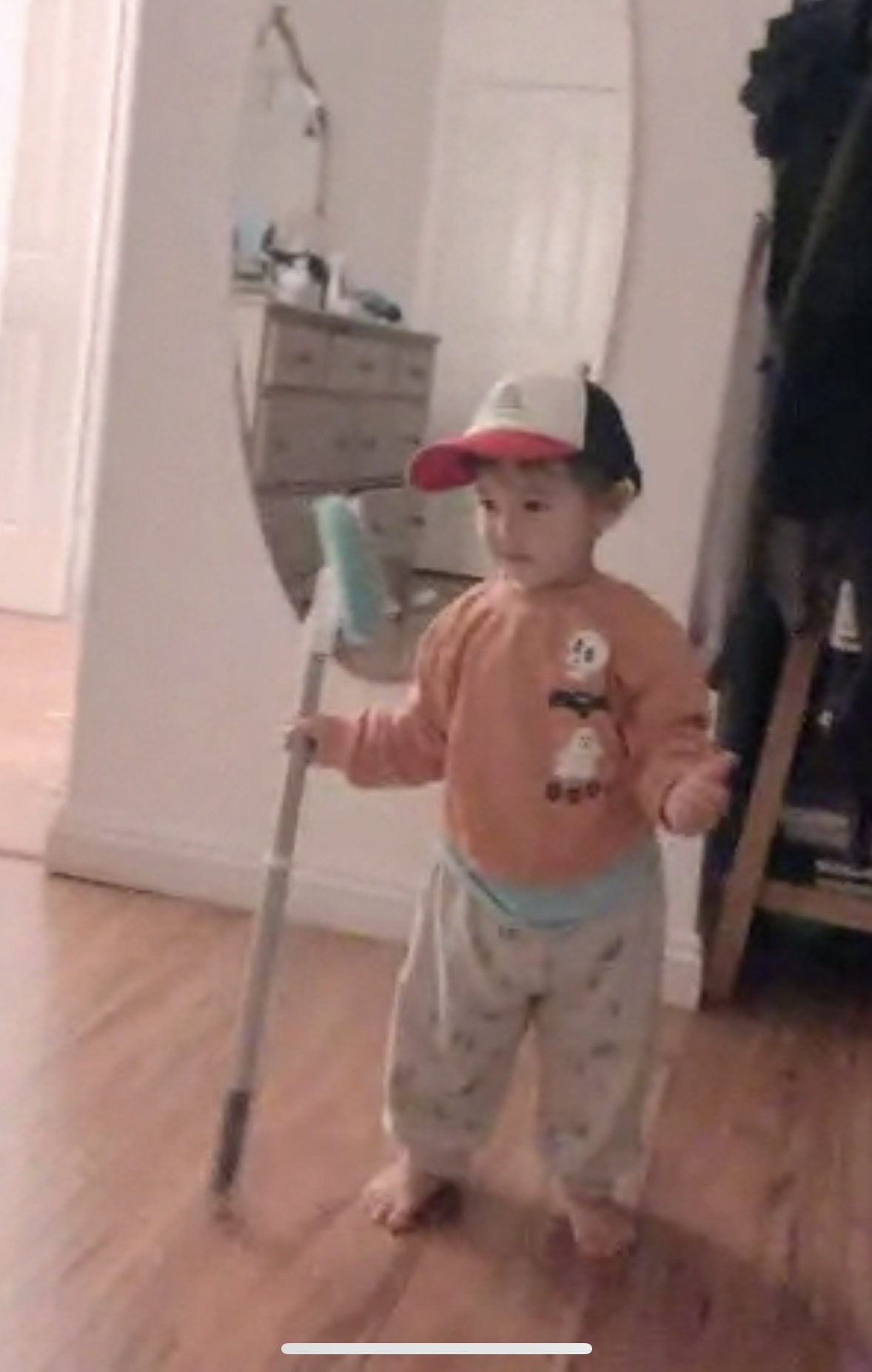 というか、今朝の日米画像付き会話中、森が掃除道具を手に取ったので、母親が帽子をかぶせたところ、必殺すす払い人的風情となる。