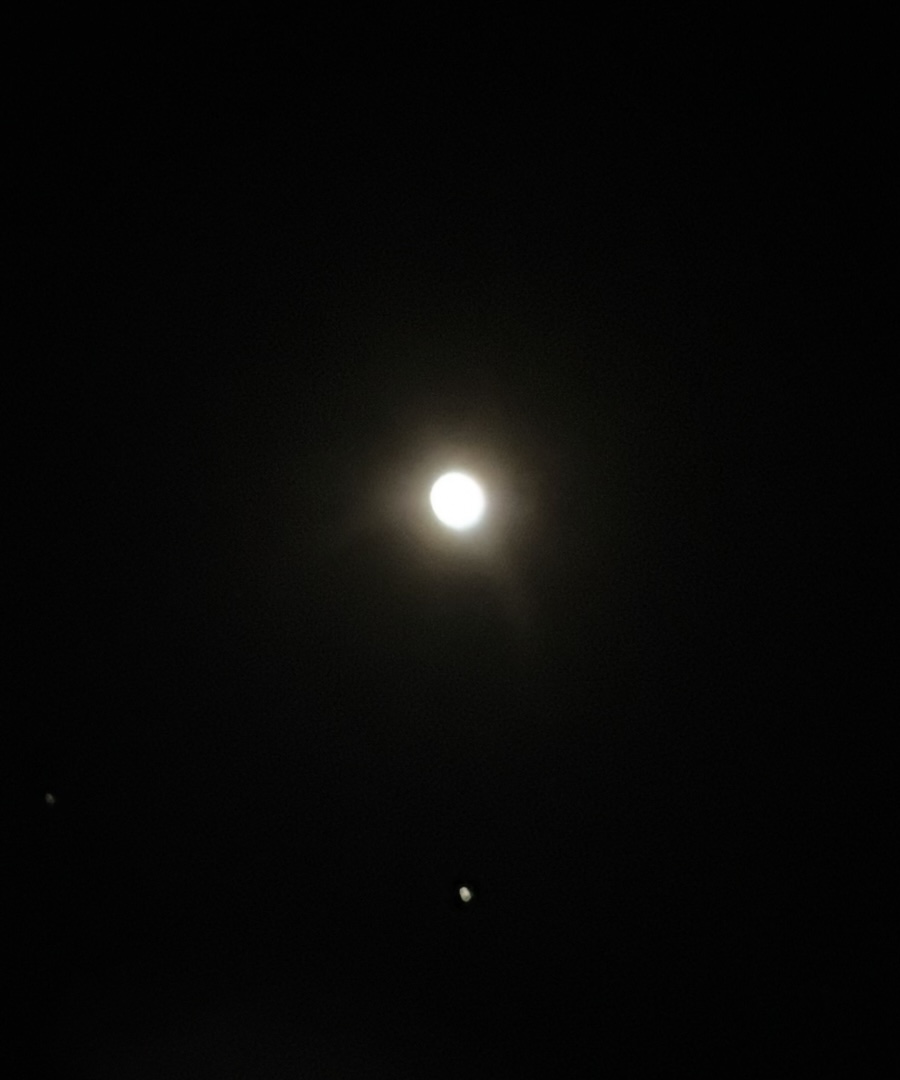 携帯を持って外に出る。よく見ると月光で地面が白い。