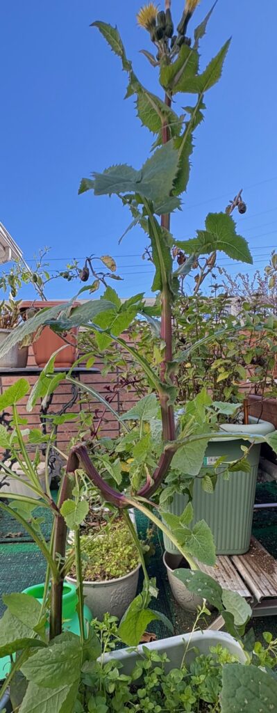 stillで始めると、「まだまだ元気で・・・」と意味になり、例えば、ベランダで繁っているこのアザミをこう表すことができる。折れたまま放っておいたのですが、なんと美事なJの字を描いていた。年を越してもである!