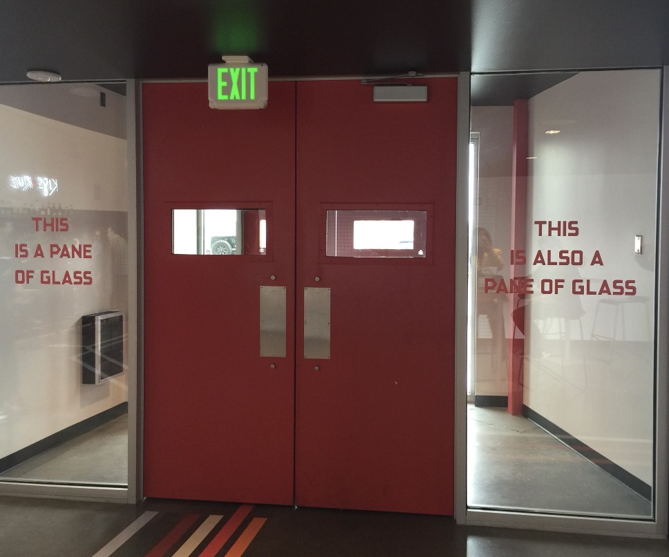 a pane of glass「ガラスの板」はa penより実利的かな。それにalso付きで大変丁寧な警告になっています。反対側から来る人は皆立ち止まって出口が混雑するのではと心配をしたり。自分の体験を思うに、A glass door could lead to paneful injuries. と言葉遊びをしていてよいものか。